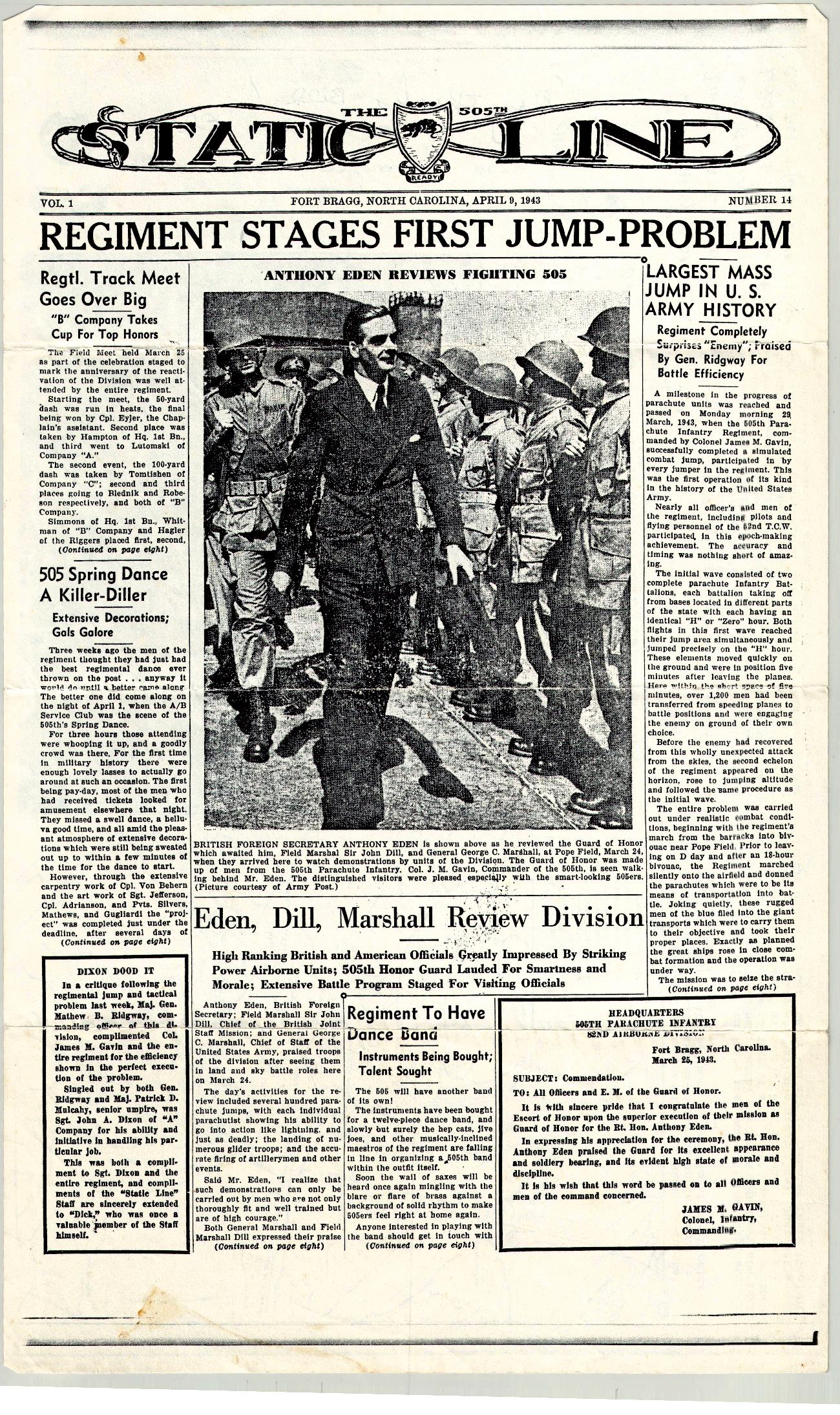 The first page of Static Line from April, 1943, reprinted by the South Jersey Chapter of the 82nd Airborne. On the back (below) is a map from D-Day, a picture of St. Mere-Eglise, and some chapter information and notes. I believe the back was written by Ed Slavin.